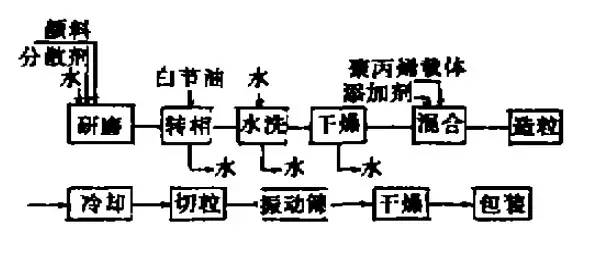 綜上,對于以濕法研磨進行顏料微粒化的丙綸色母粒生產工藝,其工藝流程框圖如圖1所示 :