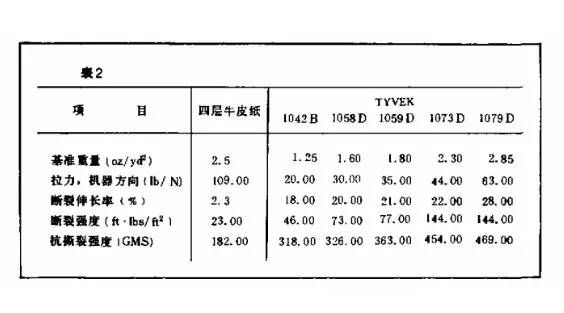 1.質(zhì)輕、強度大。無紡布包裝材料主要的特點之一是質(zhì)輕、強度大,如美國杜邦公司開發(fā)的Tyvek,密度為0.38g/cm³,其重量僅為同樣厚度牛皮紙的1/2,而強度卻高2倍以上。抗刺破強度是牛皮紙的6倍,是塑料薄膜的3~4倍。用作重包裝袋時,與4層牛皮紙的物理性能比較如表2所示。