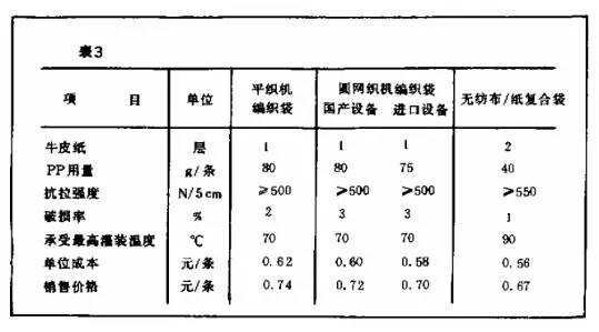 無紡布在包裝領(lǐng)域的應(yīng)用主要用作輕重包裝材料,輕包裝如郵件包裝、名貴書籍貯存封裝、精密儀器包裝、醫(yī)療器具滅菌包裝等;重包裝主要用作水泥、化工原料、化肥、農(nóng)藥、糧食、糖、鹽、礦砂、紡織品等包裝。由無紡布與二層牛皮紙復(fù)合制袋,用來包裝水泥時,其破包率僅為1%,而牛皮紙水泥包裝袋,破損率最高可達25%,編織布水泥袋,破損率為3%。無紡布與編織布水泥袋技術(shù)經(jīng)濟指標(biāo)比較如表3。(摘自:客道巴巴)